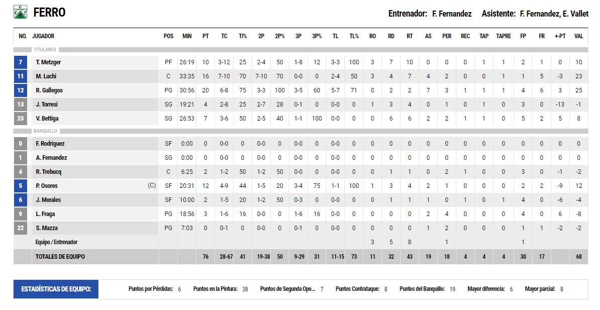 Gallegos (20 puntos y 7 asistencias) y Luchi (16, 4 y 7 rebotes) fueron los destacados en Oé, pero bien vale remarcar el esfuerzo colectivo y resaltar que Ferro llegaba invicto en Caballito (5-0) al último partido del año en el Etchart. Ahora cerrará la competencia del 2021 frente a Platense, el martes desde las 21, en Vicente López.