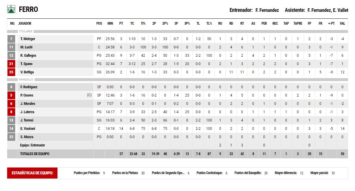 Para resaltar el contundente cuarto del conjunto de Corrientes, cabe destacar que, hasta el cierre del tercer cuarto, había sumado sólo 36 puntos mientras que en los últimos 10 minutos marcó 29, contra los 11 de Ferro. Esta diferencia fue lo que terminó siendo determinante en el marcador.