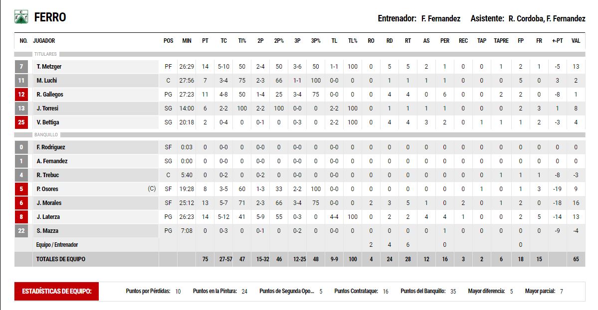 Hubo un buen inicio de Ferro en el tercer cuarto, con un nuevo triple de Metzger y un doble de Torresi que lo dejó a uno. Y un triple largo de Gallegos los puso iguales en el marcador. Sin embargo, De los Santos y Givens continuaron lastimando del otro lado de la cancha, sumado a que las pérdidas lo complicaron a Oeste y Fernández se vio obligado a pedir minuto con una desventaja de cinco puntos.