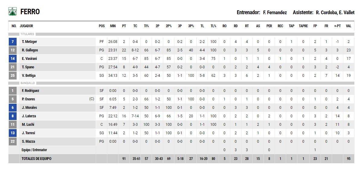 Apoyado en su juego interno, con una gran presencia de Eduardo Vasirani y Marco Luchi en la zona pintada, batallando con Hure y Cantón -los gigantes de la visita-, Ferro comenzó a encontrar los caminos para lastimar al Griego. Todo eso sumado al buen primer tiempo de Rodrigo Gallegos, que en los primeros 20 minutos, manejó los hilos de los ataques de Oé y sumó 11 puntos, solo un adelanto de lo que iba a ser su gran noche en Caballito.