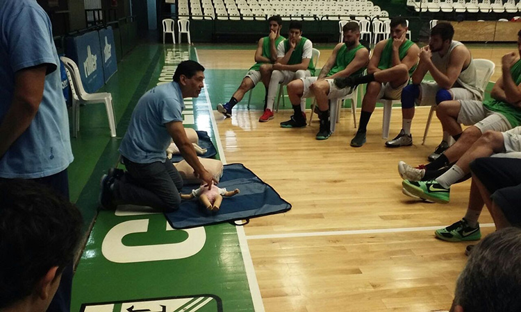 El viernes por la mañana, el plantel profesional de básquet recibió a los técnicos en emergencias Hugo González y Oscar Bustos, quienes dictaron el curso de Resucitación Cardiopulmonar (RCP) para jugadores y cuerpo técnico, gracias al convenio entre la Asociación de Clubes y la Asociación de Técnicos de Emergencias.