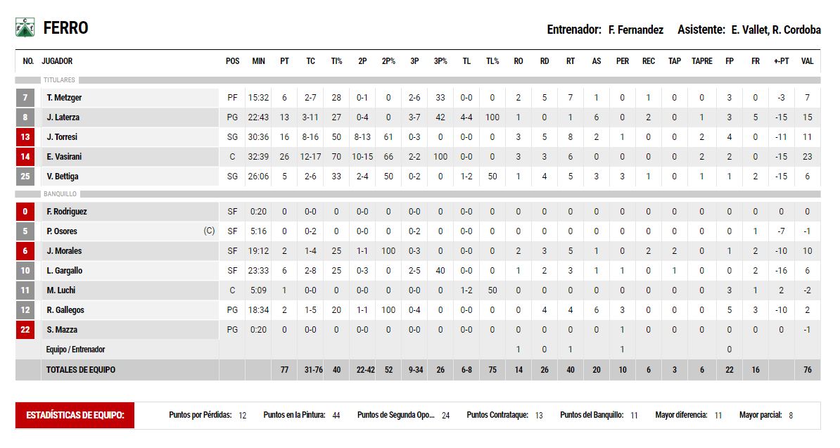 Ya en el último cuarto, Ferro sintió el desgaste, jugó condicionado por las faltas y diversas lesiones musculares de Pablo Osores y Valentín Bettiga, y el local se presentó con toda la intención de liquidar la serie. Volvieron a brillar sus extranjeros y, para colmo, también ajustaron la mira desde el perímetro. Y si bien Ferro siguió buscando, ya terminó de hacerse todo definitivamente cuesta arriba después de dos intentos fallidos de tres, con una diferencia de 11 puntos y 1:55 por jugar. La chapa final fue 97-77, con Eduardo Vasirani como goleador del juego con 26 tantos.