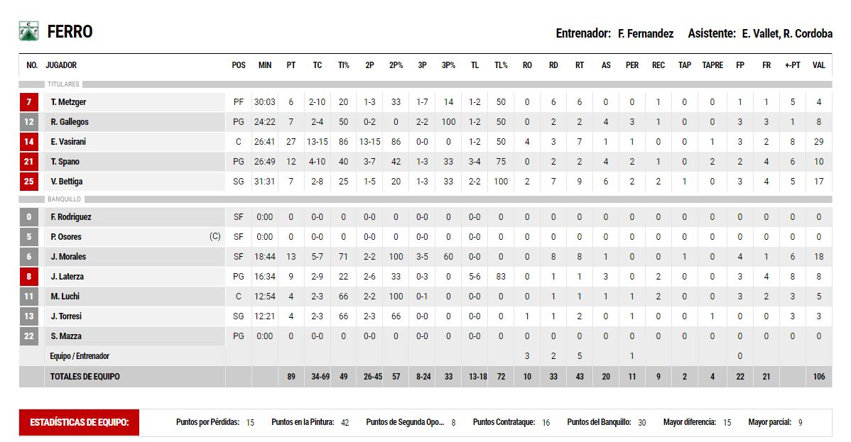 En el segundo parcial, Federico Fernández comenzó a mover el equipo y el aporte desde la banca fue importante para que Ferro pudiera encontrar el estilo con el que se siente más cómodo, con transiciones rápidas, juego fluido y movilidad de la pelota. Así se vio un partido más parejo, punto a punto, con buenos pasajes de Julián Morales (dos triples en el cuarto), Juan Ignacio Laterza y Jonatan Torresi.
