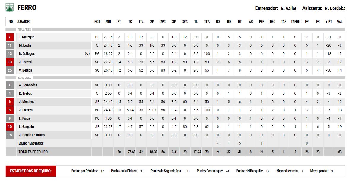 Si bien Ferro se mostró bien parado en defensa, sobre todo en el último tramo del cuarto, intentando neutralizar el juego interno del rival, en ataque le siguió costando mostrar la fluidez habitual que suele tener el Verdolaga. Eso se vio reflejado en el bajo goleo de Oé en el primer tiempo: 30 puntos.