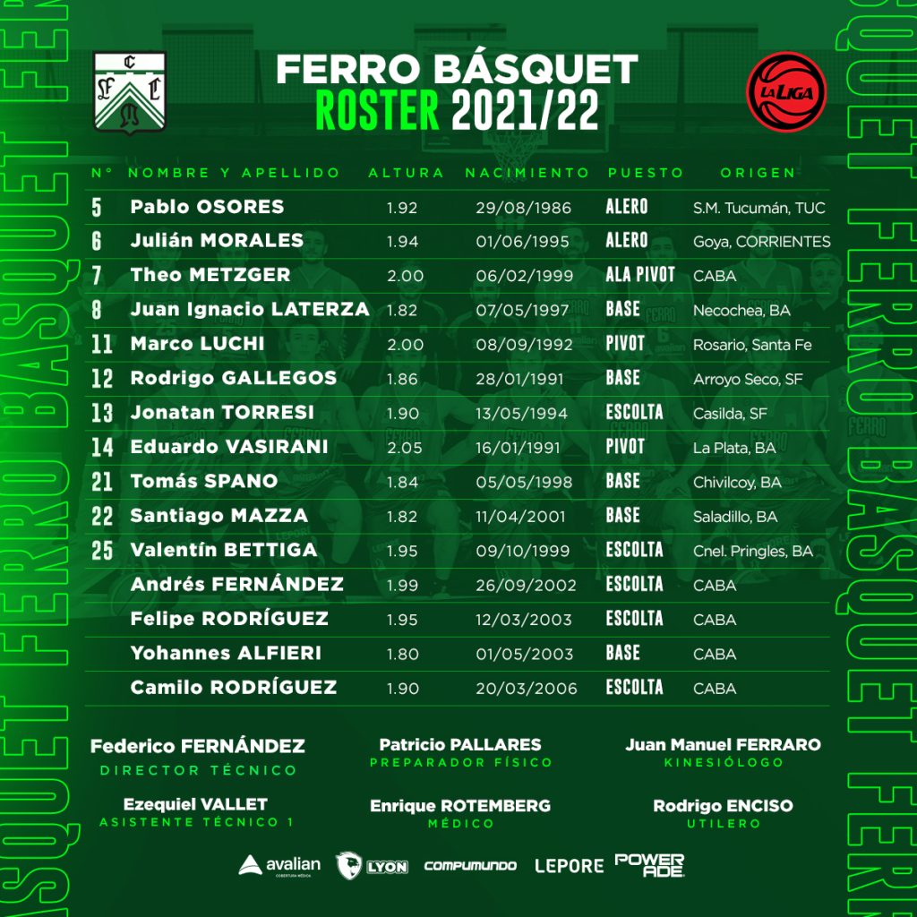Con la base de la temporada pasada, con Tomás Spano, Valentín Bettiga, Eduardo Vasirani y Theo Metzger nuevamente con la camiseta verdolaga, Ferro se reforzó buscando consolidar la propuesta del entrenador. Así, a los viejos conocidos se sumaron el base Rodrigo Gallegos, el alero Julián Morales, el escolta Jonatan Torresi, el pivot Marcos Luchi y el base Juan Ignacio Laterza.