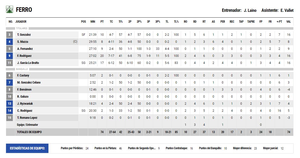 Sin embargo, en el cuarto final, Ferro recuperó el ritmo y el orden, volvió a soltarse en ofensiva, y cerró un parcial de 20-14 para llevarse la victoria por 74-60. Felipe Rodríguez fue el máximo anotador del partido, con 20 puntos y 6 rebotes. Además, Joaquín Lo Brutto aportó otros 17 tantos. En la visita se destacó Díaz Muller, con 19.
