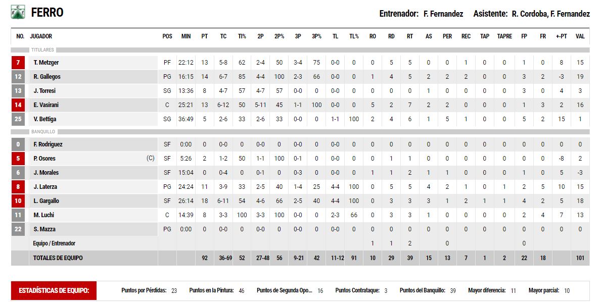 Pero el muy bien inicio de Ferro en los 10 minutos finales presagiaron lo que vino después. Volvieron las estocadas de Torresi, y Metzger metió una daga de tres para revertir el resultado. Sin embargo, sobre la chicharra, del otro lado Arengo también clavó un triple en la jugada siguiente y parecía que todo pasaría a ser punto a punto. Y así se llegó hasta el último minuto y medio de juego. Con un Luchi que fue faro en ataque, con Laterza aportando su movilidad y tomando la conducción en momentos calientes, y con las combinaciones entre el pivot y el base que le dieron resultado al planteo táctico de Fernández, que apostó por Nacho para el cierre del juego. Regatas padeció la intensidad defensiva de Oeste, tomó malas decisiones en ofensiva y, a 1m26 del final, en el momento justo, Ferro alcanzó su máxima diferencia con otro bombazo de Metzger para ponerse 6 arriba. ¿Qué vino después? Otra muestra de carácter de Ferro para cerrar el partido holgadamente, con un triunfo 92-83 que lo deja sexto en la tabla de posiciones de la Liga Nacional.