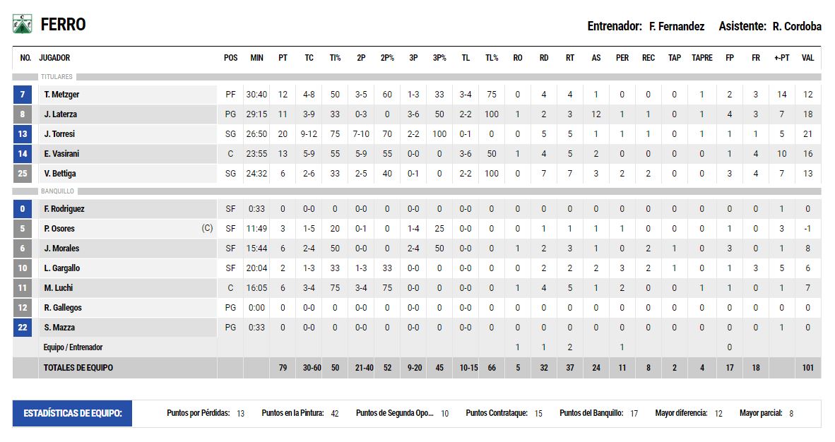 En el parcial final, Ferro siguió intentando alejarse en el marcador –y consiguiéndolo por momentos-, pero con un Tachero que se jugaba la vida en este partido y así lo demostró en cada pelota para ponerse a 1 a falta de 4m14 para el cierre. Aunque con jerarquía y carácter, Ferro marcó la diferencia en el final y se terminó llevando la victoria por 79-68.