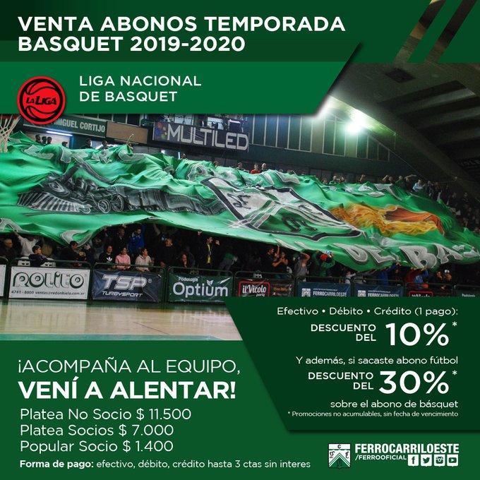 Ya están a la venta los abonos de básquet para la temporada 2019/20. Los mismos servirán para el Torneo Súper 20 y para La Liga Nacional, en todos los partidos que Ferro juegue de local en el Héctor Etchart. Adquirilos en las Oficinas de Socios del Club.