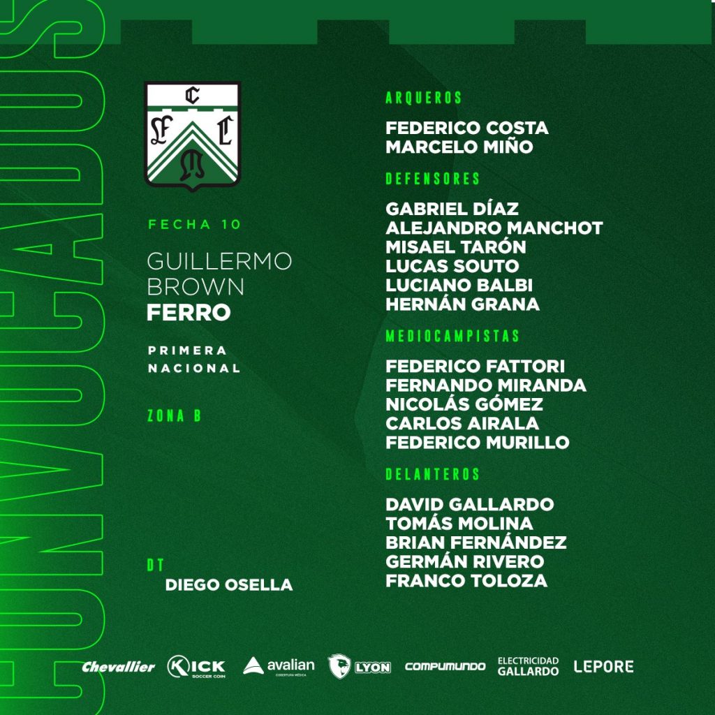 Ferro está de racha. Tras conseguir su tercer éxito al hilo en Caballito ante Atlético de Rafaela y en el mejor momento desde que empezó el campeonato, el Verdolaga intentará seguir por la buena senda este domingo ante el colista Guillermo Brown. El encuentro, correspondiente a la Fecha 10 de la Primera Nacional, se disputará en el Estadio Raúl Conti desde las 15 (con transmisión de TyC Sports Play).