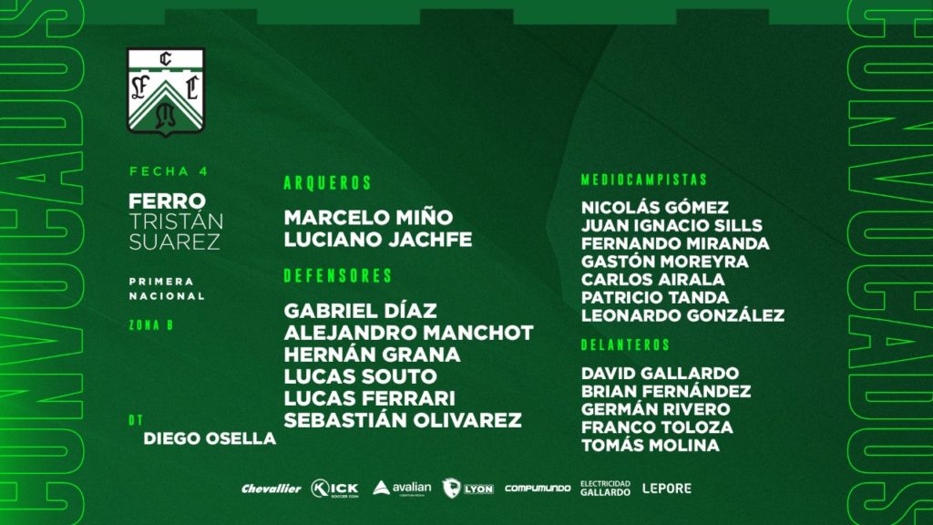 El plantel se entrenó en Escobar este sábado por la tarde y al término de la práctica, el entrenador Diego Osella dispuso la lista de convocados para el duelo con el Lechero. Los futbolistas que formarán parte de la delegación son: