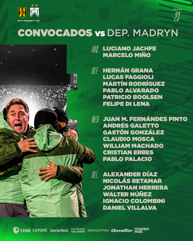 El posible once del equipo de Puerto Madryn es con Nicolás Temperini; Facundo Ardiles, Jorge Zules Caicedo, Franco Godoy (vistió la camiseta Verdolaga en la temporada pasada), Hernán Zuliani; Cristian Núñez, Federico Recalde, Matías Villarreal, Nicolás Sánchez; Leonardo Marinucci y Lucas González. González es el segundo máximo goleador del certamen, con 13 tantos.