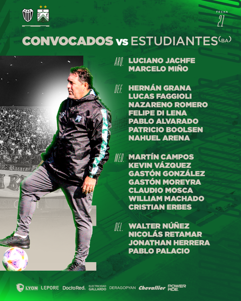 Con las ausencias de Martín Rodríguez -purgará suspensión tras la expulsión ante Brown- y Alexander Díaz -asuntos personales-, y los regresos a la lista de Nazareno Romero y Walter Núñez, los futbolistas citados son: