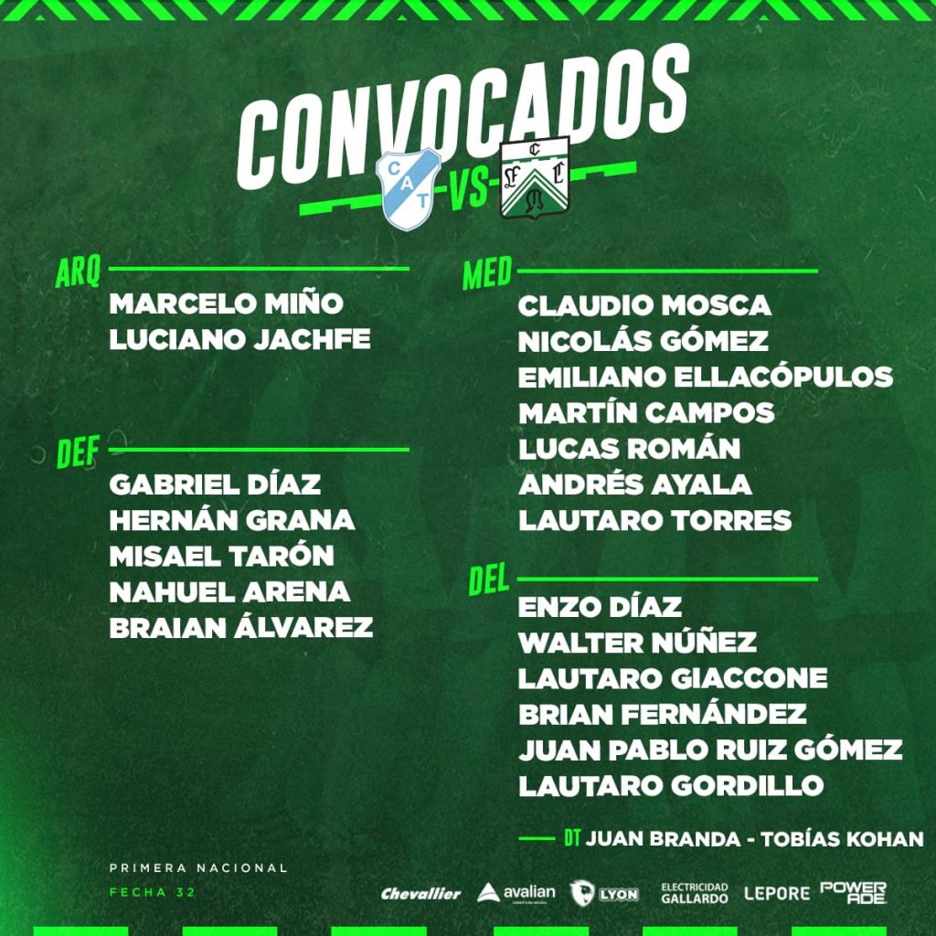 Con los regresos de Mosca y Arena tras cumplir suspensión, las bajas de Murillo, Keko Villalva y Cáceres por lesión, y las reapariciones de Ellacópulos y Braian Álvarez, los jugadores que quedaron concentrados son: