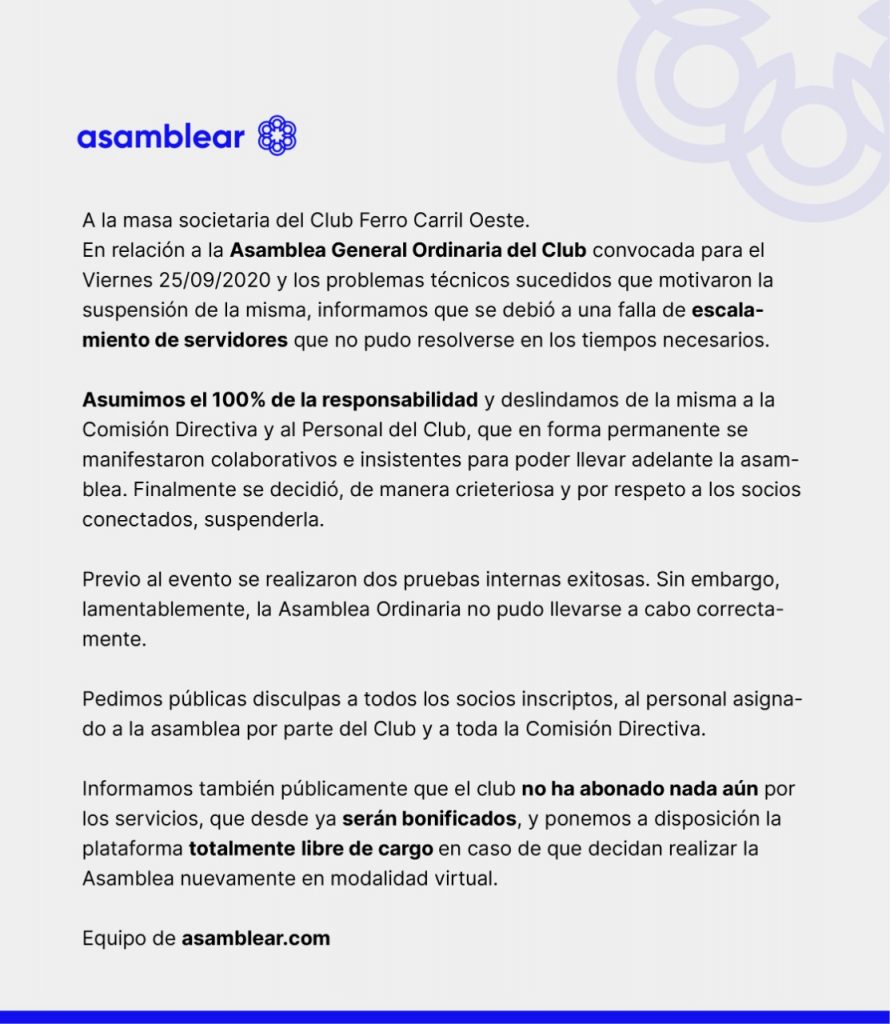Adjuntamos el comunicado de la firma Asamblear sobre los problemas técnicos que impidieron la realización de la Asamblea