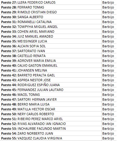 | Puesto 37: DOMINGUEZ JIMENA SOLANGE | BARBIJO | |