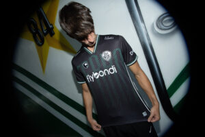 La tercera camiseta se destaca por su tono negro predominante, combinando sobriedad y potencia visual. Sobre la base oscura se integran líneas y detalles en verde, generando un diseño moderno y audaz. El escudo monocromático y los detalles gráficos donde se escribe “Ferro” refuerzan una estética urbana y contemporánea, pensada para un club fuerte, actual y con presencia dentro y fuera de la cancha.