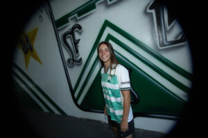 La camiseta alternativa apuesta por un diseño a rayas horizontales anchas en tonos verde claro y blanco, logrando una imagen fresca, moderna y distintiva. El contraste de colores resalta la impronta verdolaga desde una mirada renovada. El escudo del club se presenta en una versión limpia y bien visible, acompañado por detalles oscuros en cuello y mangas que equilibran el diseño y le aportan carácter.