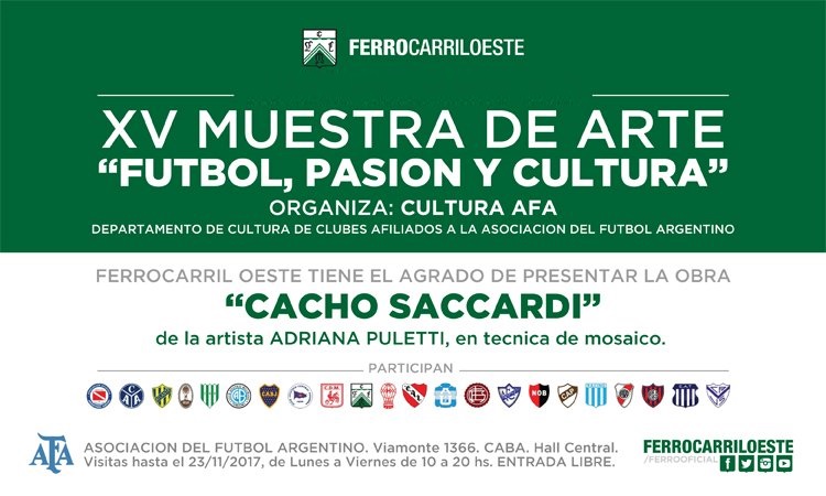Ferro tiene el agrado de presentar la obra: «Cacho Saccardi», de la artista Adriana Puletti, en técnica mosaico. La entrada es libre y gratuita, en AFA (Viamonte 1366, CABA) y podés visitarla hasta el 23 de noviembre.
