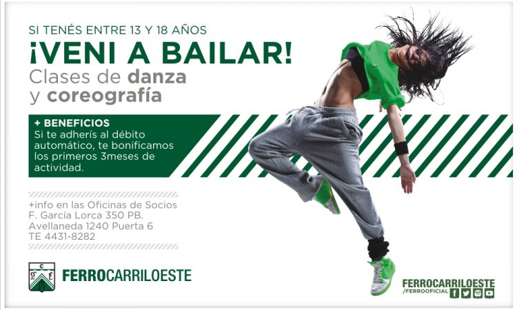 En Ferro hay nuevas clases de Danza y Coreografías. Si tenés entre 13 y 18 años, ¡te esperamos!. Los socios que adhieran al débito automático tendrán actividad bonificada por tres meses. Más información en la Oficina de Socios de la Sede, ubicada en García Lorca 350 o en la de Puerta 6, en Avellaneda 1240.